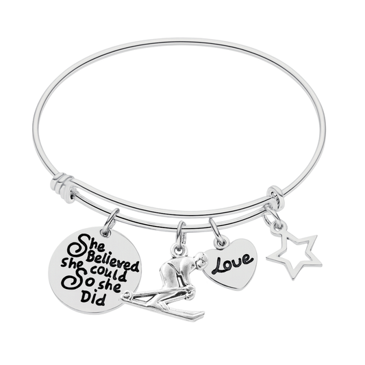 She Believed She Could So She Did Ski Bracelet – Inspirational Bangle with Skier, Love & Star Charms | Sportybella
