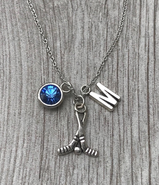 Personalized Ice Hockey Stick Necklace with Letter & Birthstone Charm