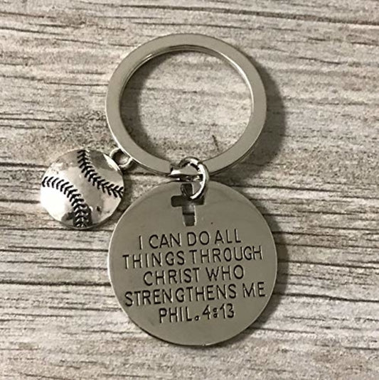 Softball Faith Charm Keychain, I Can Do All Things Through Christ Who Strengthens Me