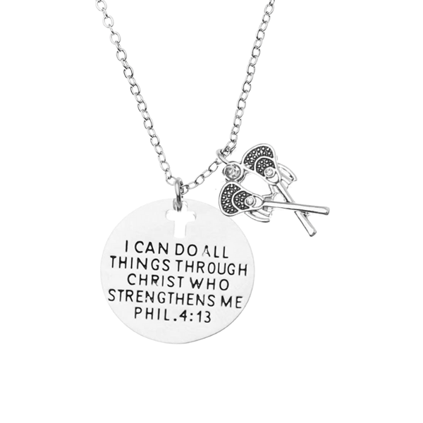 - LACROSSE NECKLACE - Beautiful silver plated I Can Do All Things Through Christ Who Strengthens Me Phil 4:13 charm with lacrosse charm on 17 inch chain with 2 inch extension.