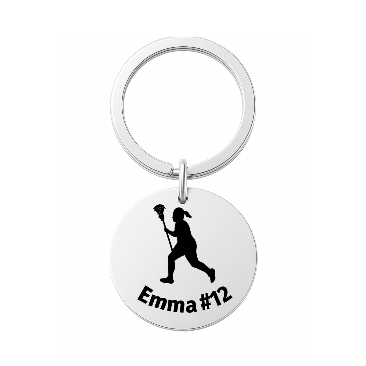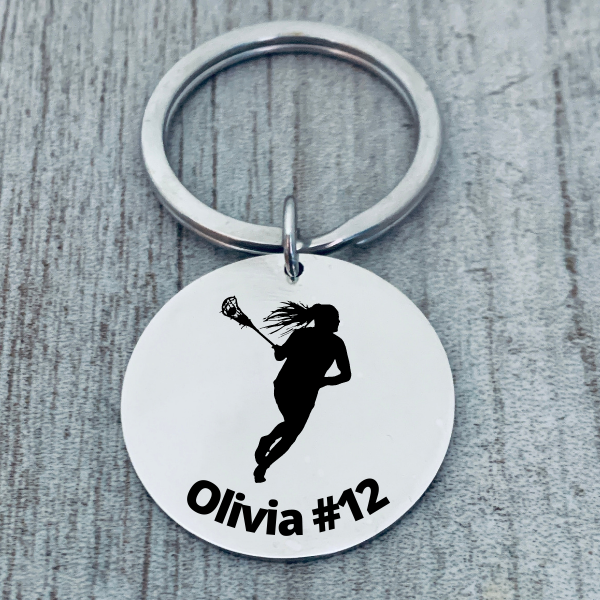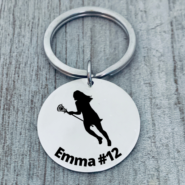 - LACROSSE KEYCHAIN- Custom Stainless Steel Lacrosse Charm on key ring with your choice of engraving