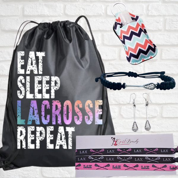 - Lacrosse Eat Sleep Lacrosse Repeat Nylon Drawstring Bag- This 14" W x 18"H bag is perfect for school, travel, or to carry clothing and equipment to and from practice.