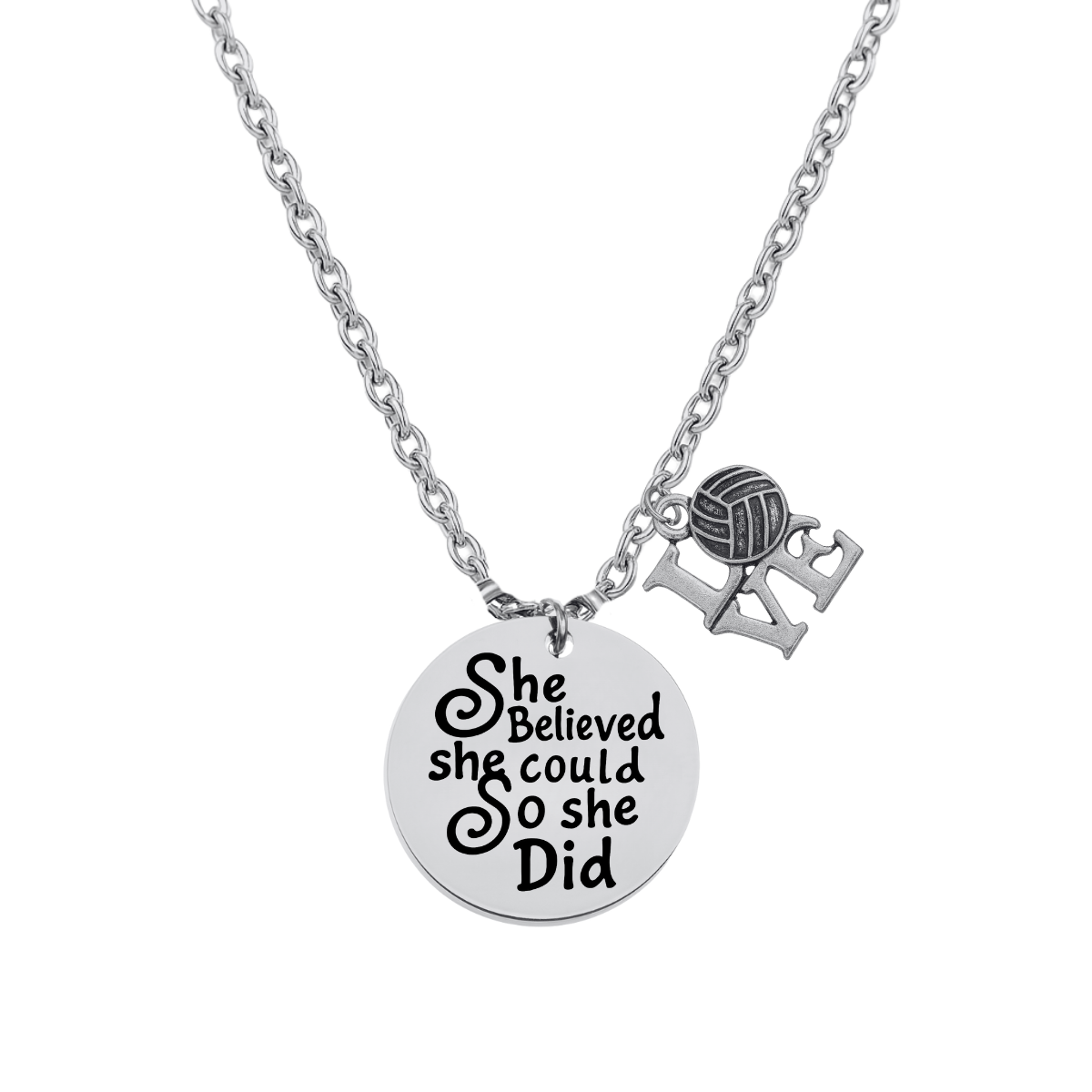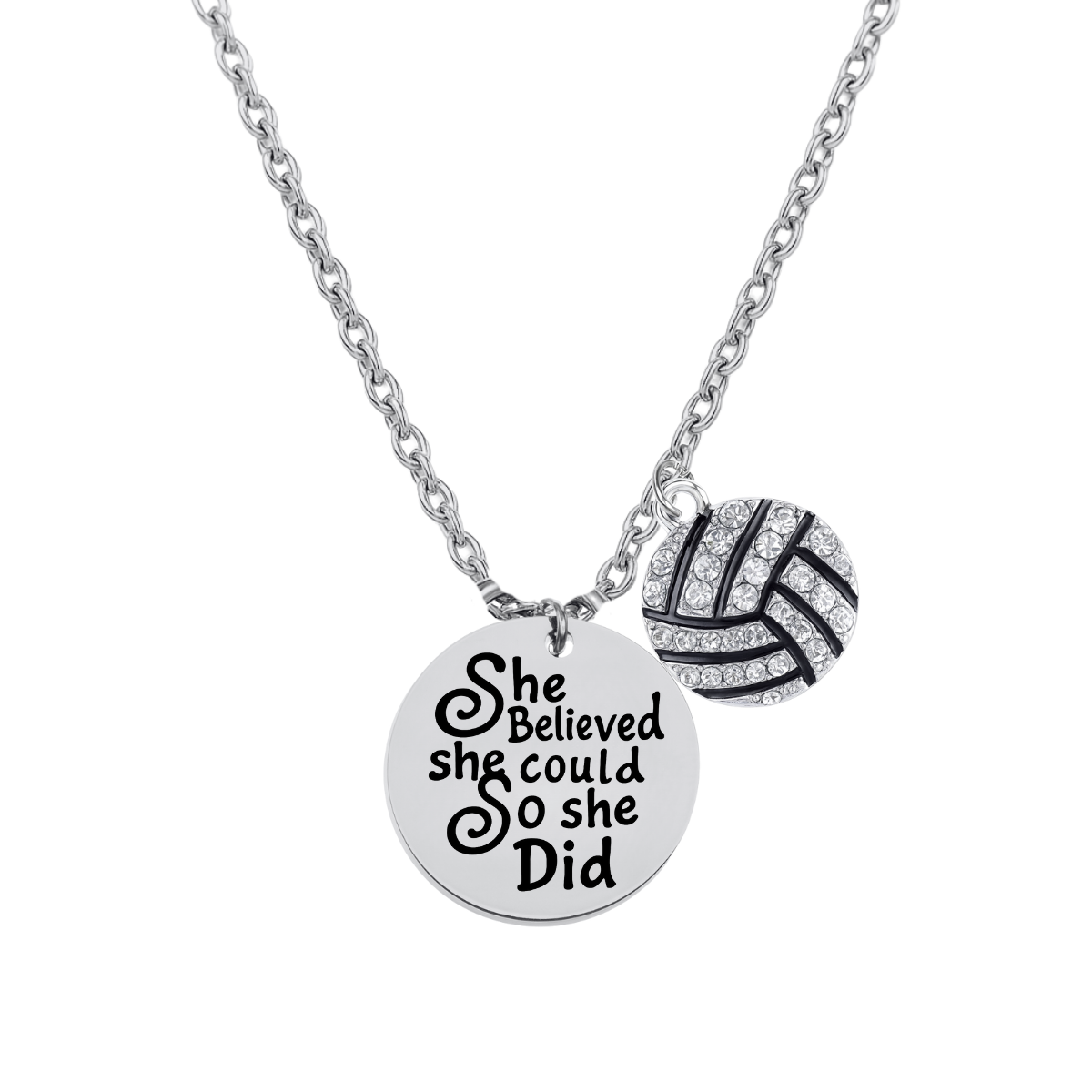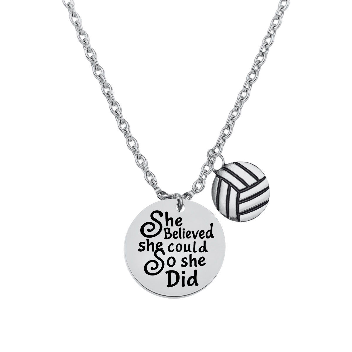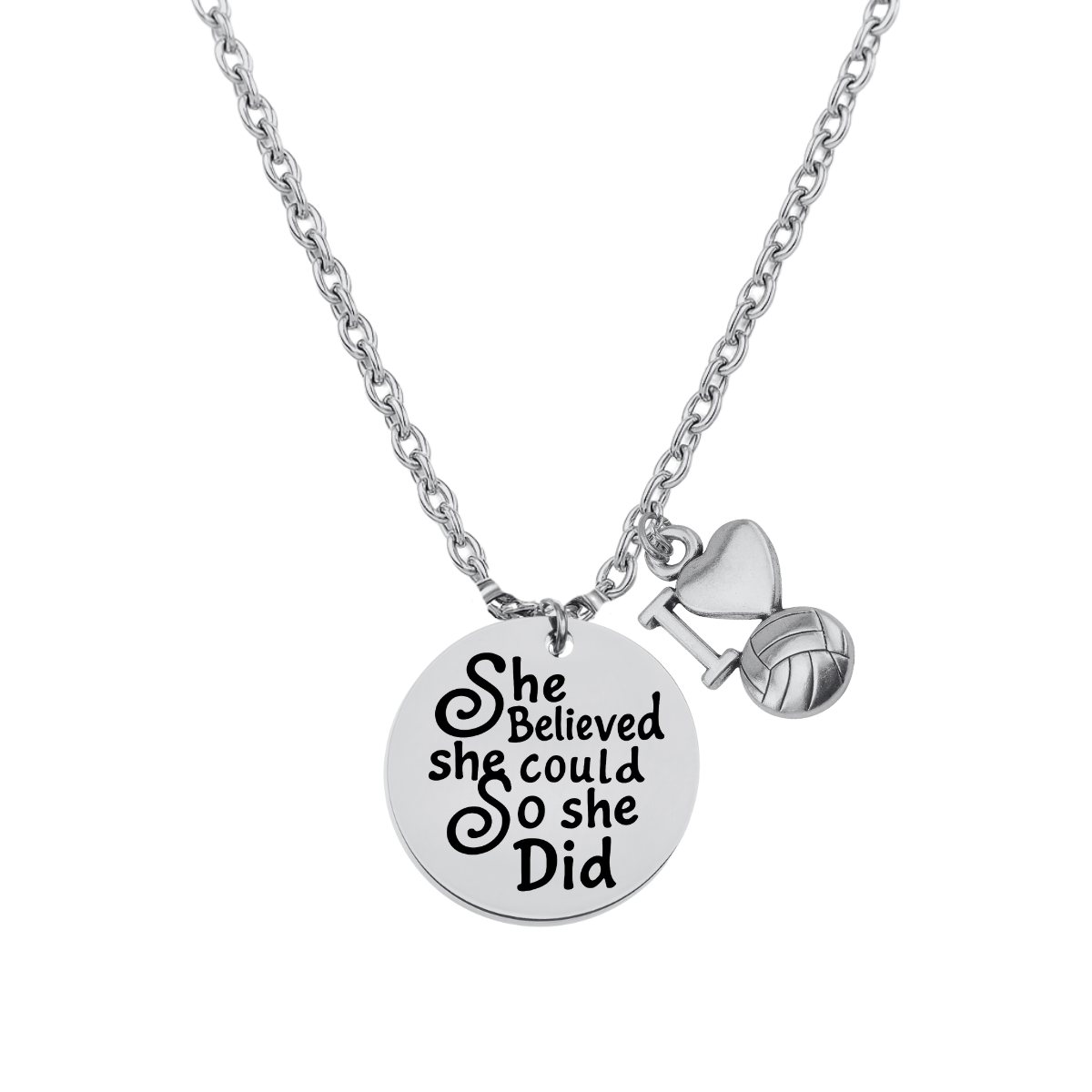- VOLLEYBALL NECKLACE- 1/2 inch Silver Plated Volleyball She Believed She Could so She Did Charm on 17 inch Chain