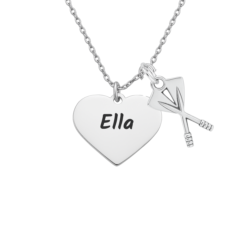 - ROWING NECKLACE- Stainless Steel Heart charm with your choice of name engraved with oar pendant Measures 1/2" on 17"chain with a 2" extension.