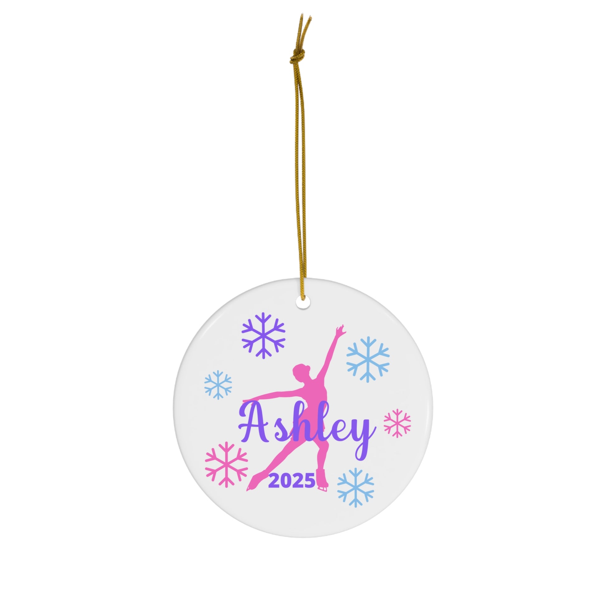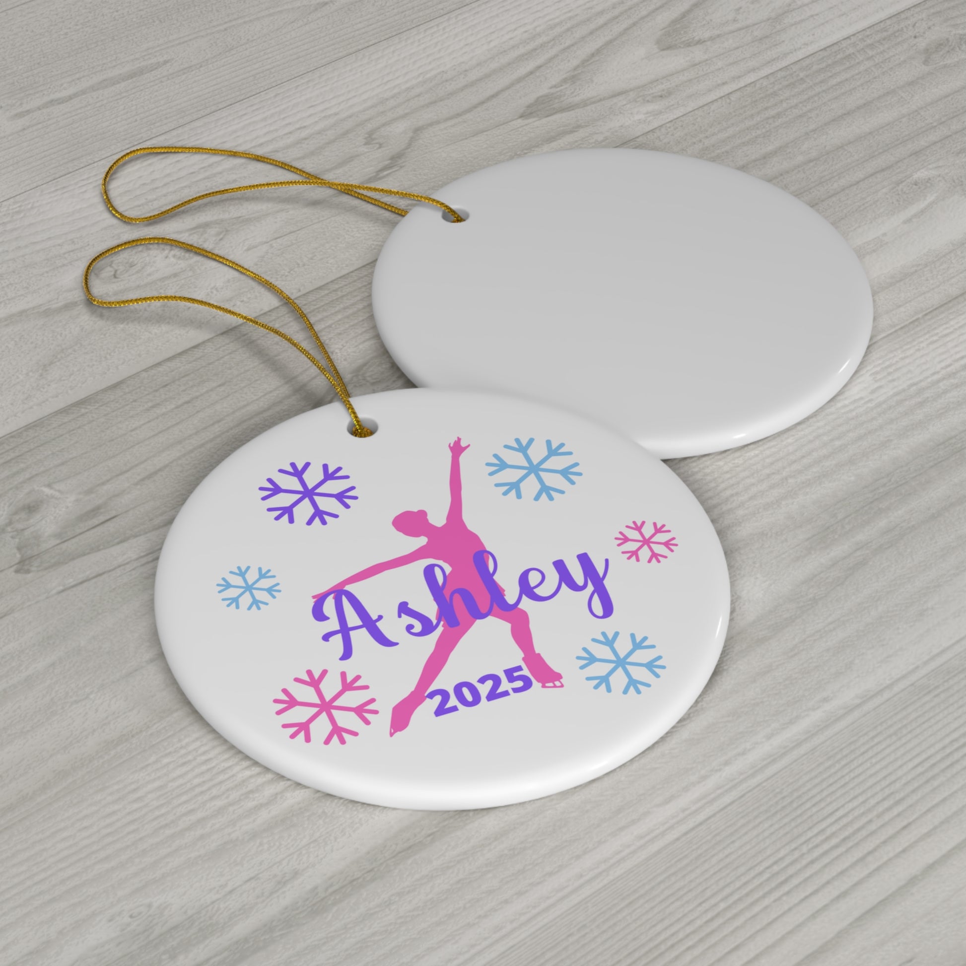 This figure skating ornament is a perfect keepsake for years to come! The design is printed on a flat, round, ceramic ornament 2.84 inches in width.