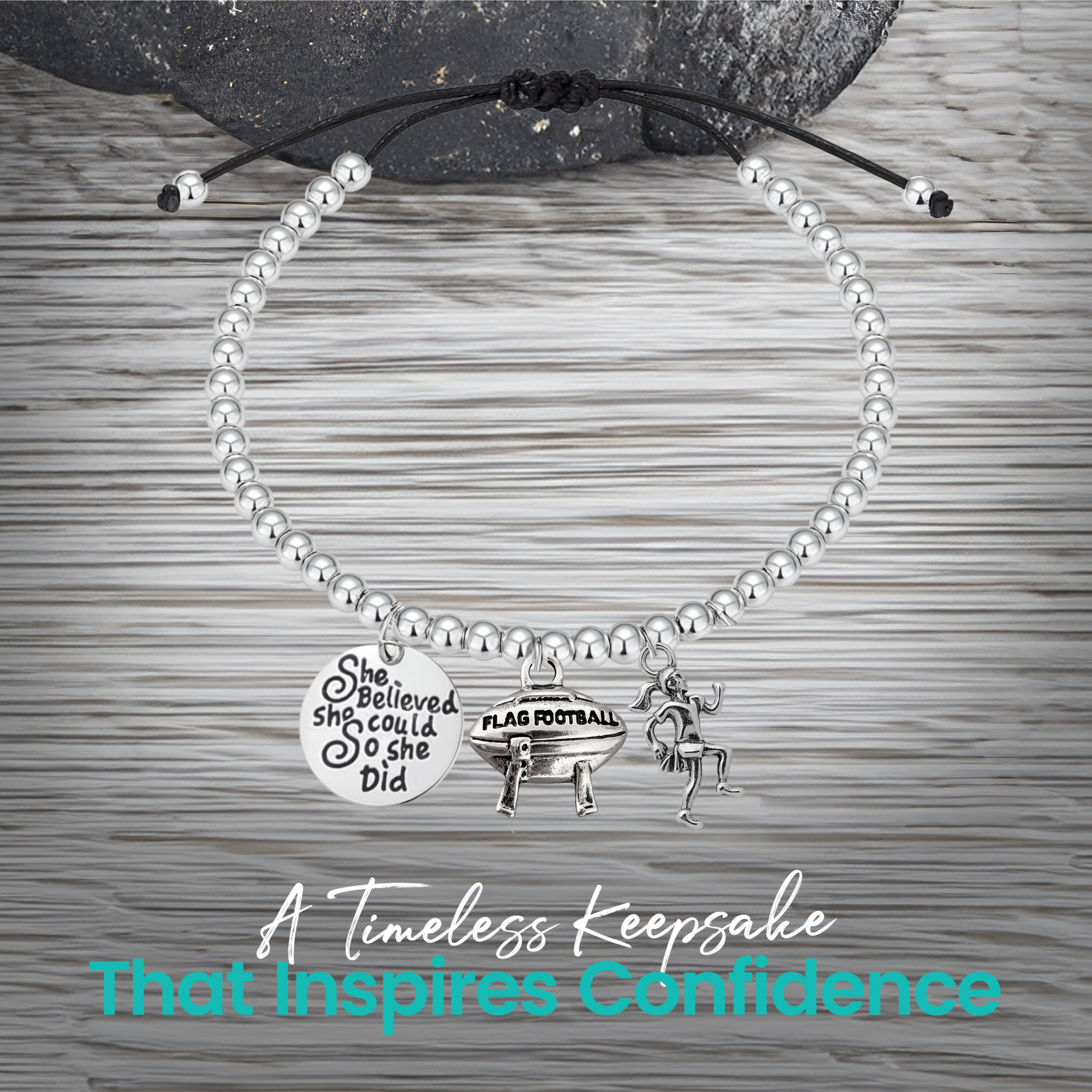 Celebrate your love for the game with Sportybella’s Flag Football Bead Chain Bracelet. This stylish silver beaded bracelet features three meaningful charms — a flag football goalpost, a female player, and the empowering quote “She Believed She Could So She Did.”