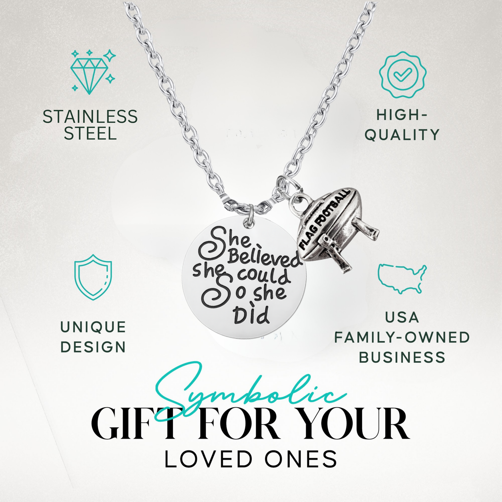 🏈 For the girl who plays with heart, courage, and confidence! Celebrate the love of the game with Sportybella’s Flag Football Necklace. This elegant silver stainless steel necklace features three meaningful charms — a “She Believed She Could So She Did” quote pendant, a flag football charm, and a female player charm — symbolizing empowerment and strength on and off the field.