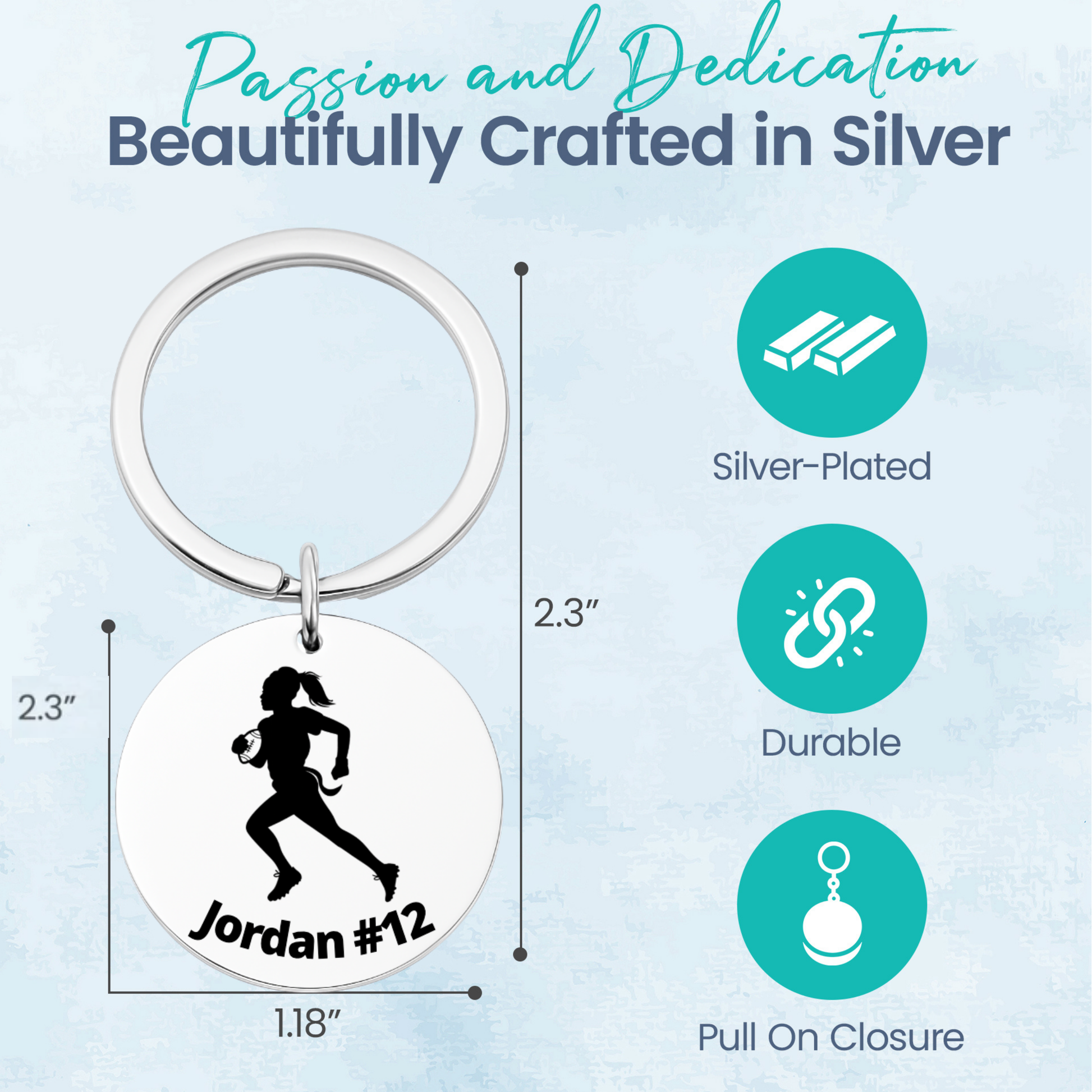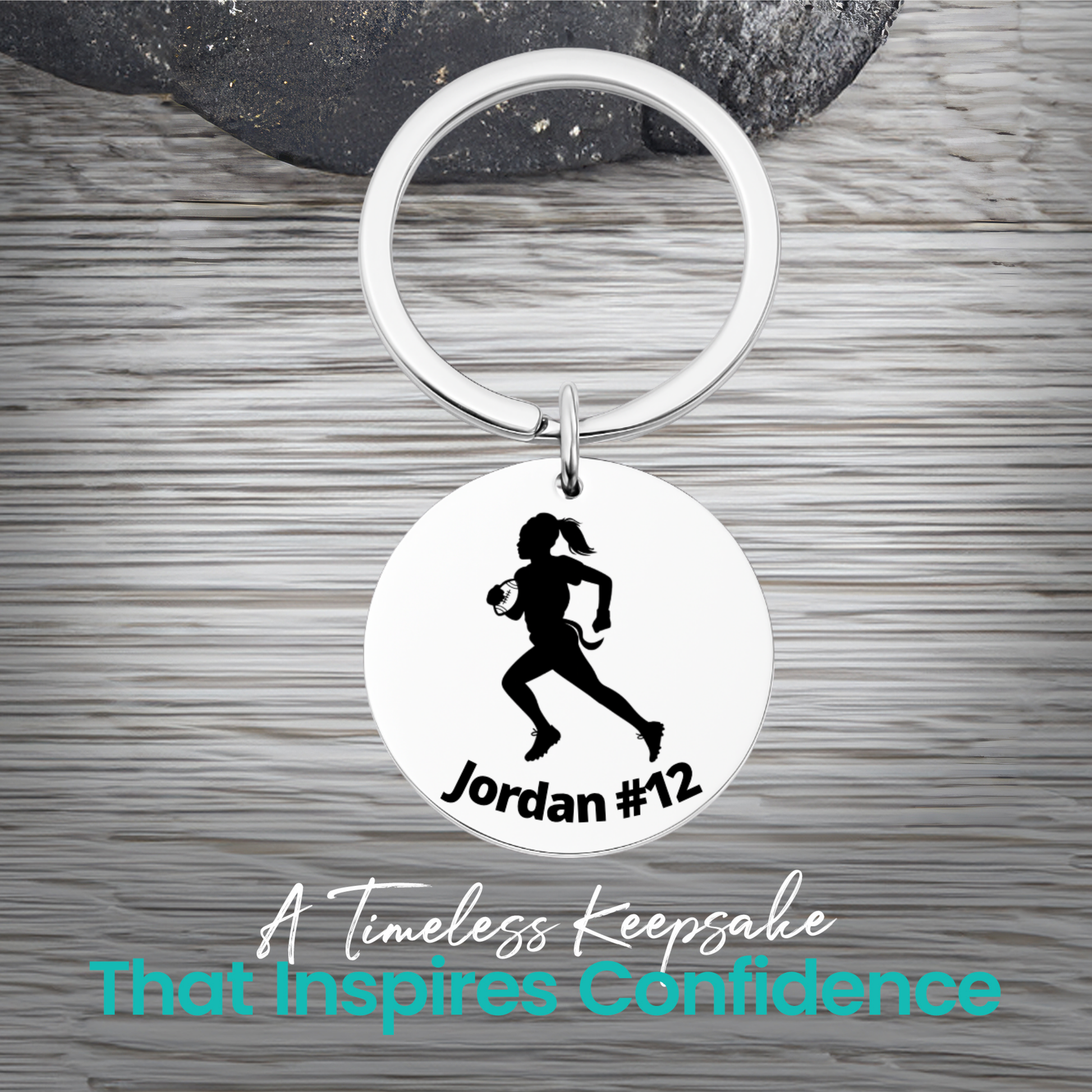 🏈 A meaningful keepsake for every flag football player and fan! Celebrate the spirit of the game with Sportybella’s Personalized Flag Football Keychain. Crafted from high-quality stainless steel, this keychain features a female flag football player silhouette and your custom engraved name and jersey number — making it a unique accessory that players, coaches, and fans will love.