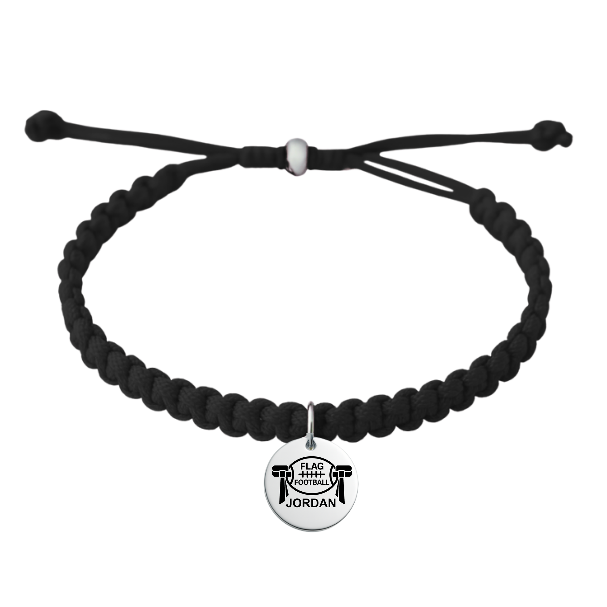 Celebrate your love for flag football with Sportybella’s Personalized Flag Football Rope Bracelet. Crafted from durable macrame rope and featuring a custom-engraved stainless steel charm, this bracelet is the perfect way to show pride and appreciation. Choose from multiple vibrant team colors and personalize it with a name, number, or meaningful word.