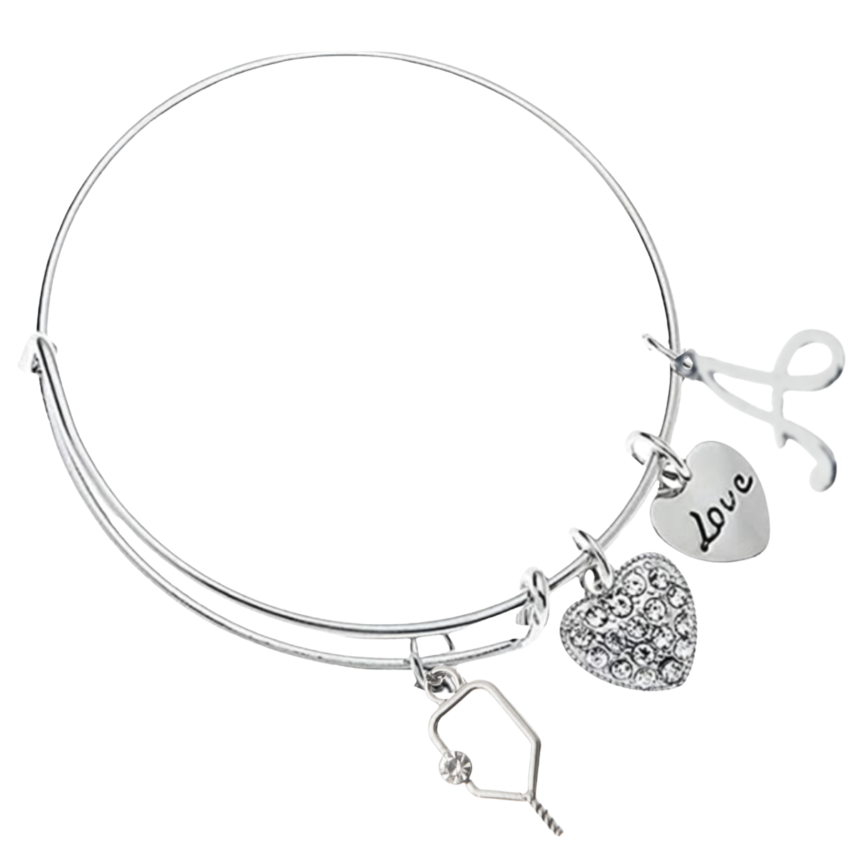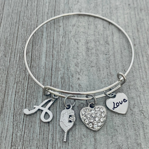 - PICKLEBALL CHARM BRACELET- Silver Plated Charms on Stainless Steel Bangle with your choice of letter charm