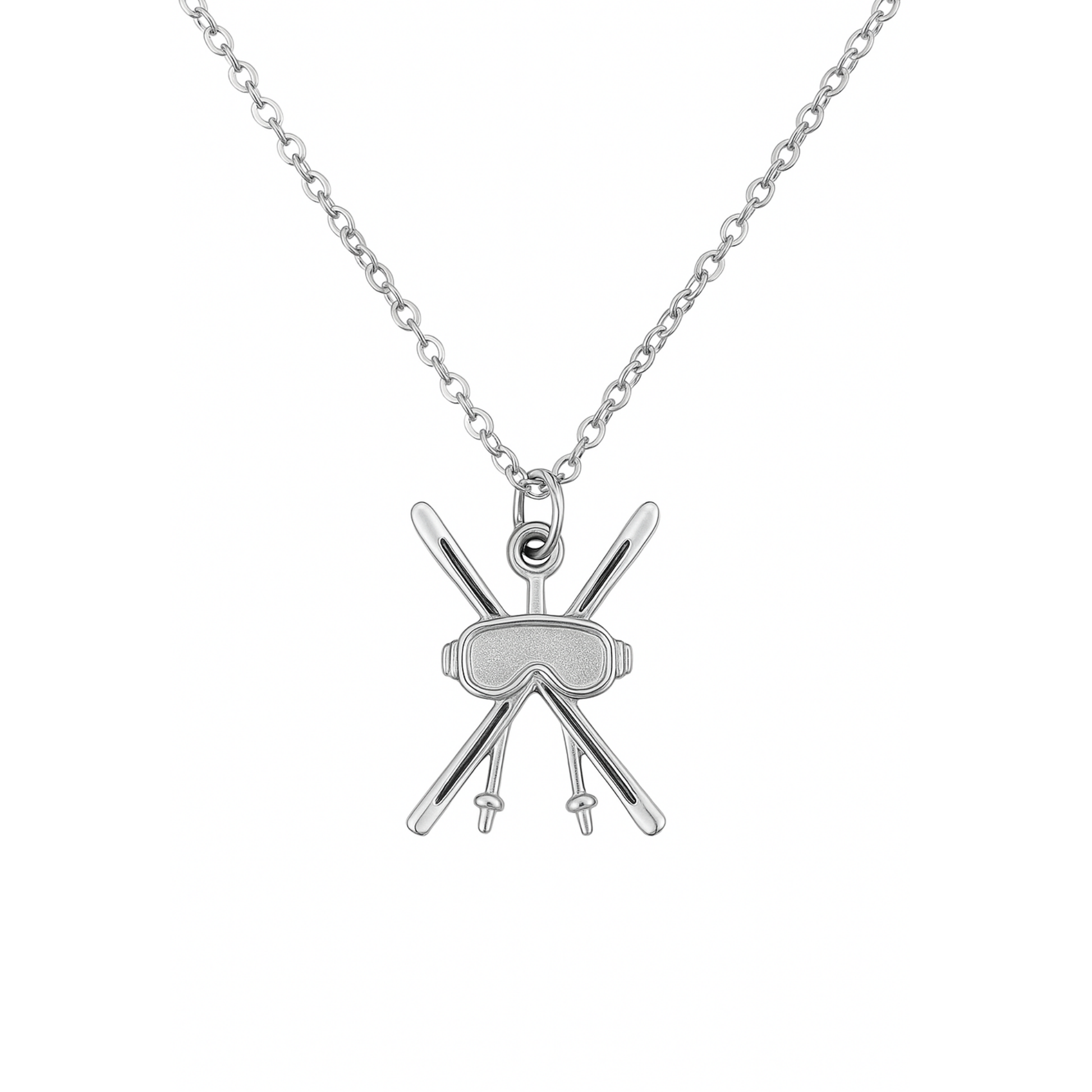 - Ski themed pendant featuring crossed skis, poles and goggles for a fun sporty look