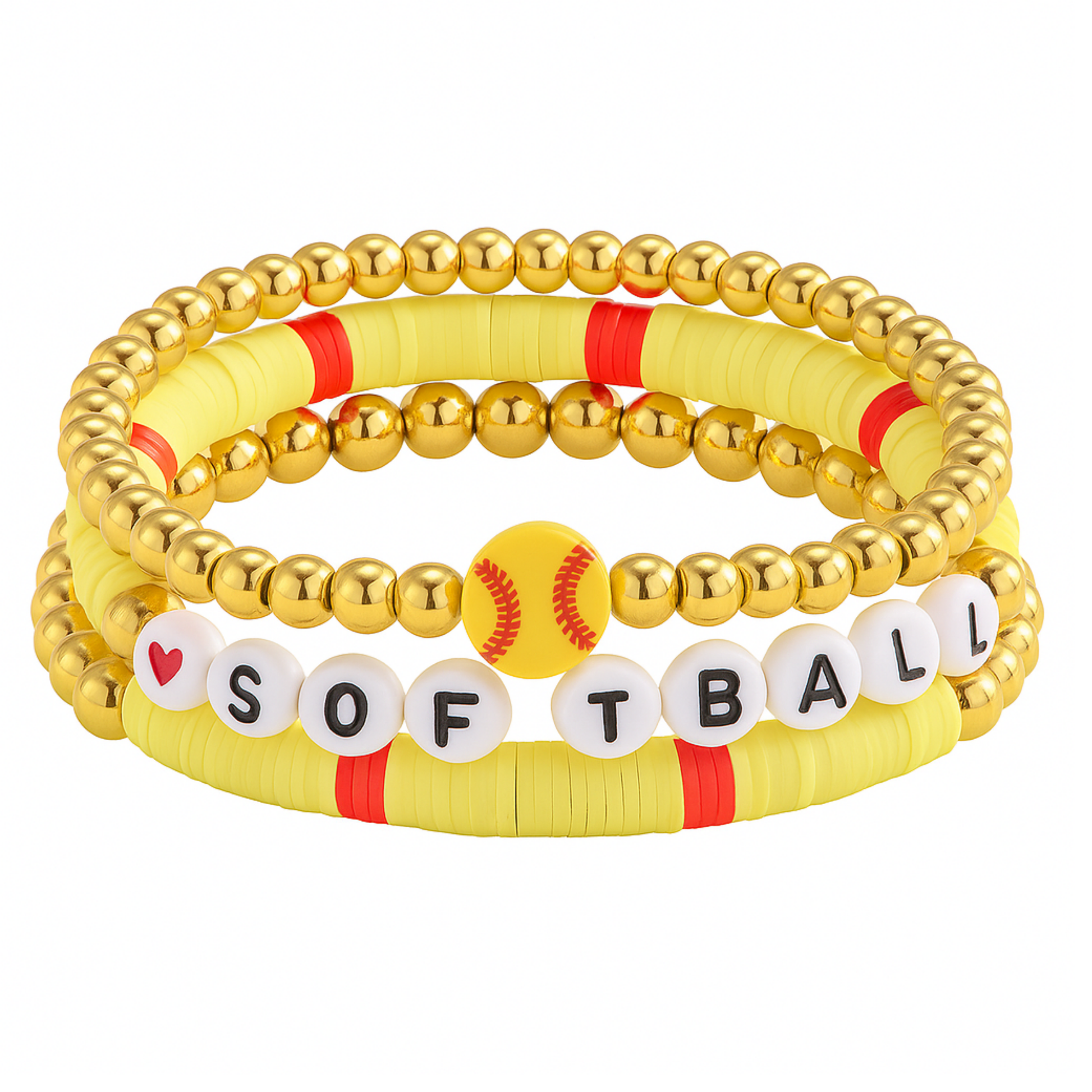 Show your love for softball with this cute stackable bracelet set. Designed with bright orange heishi beads, gold accent beads, and a center softball bead, this set is perfect for players, fans, coaches, and team gifts.