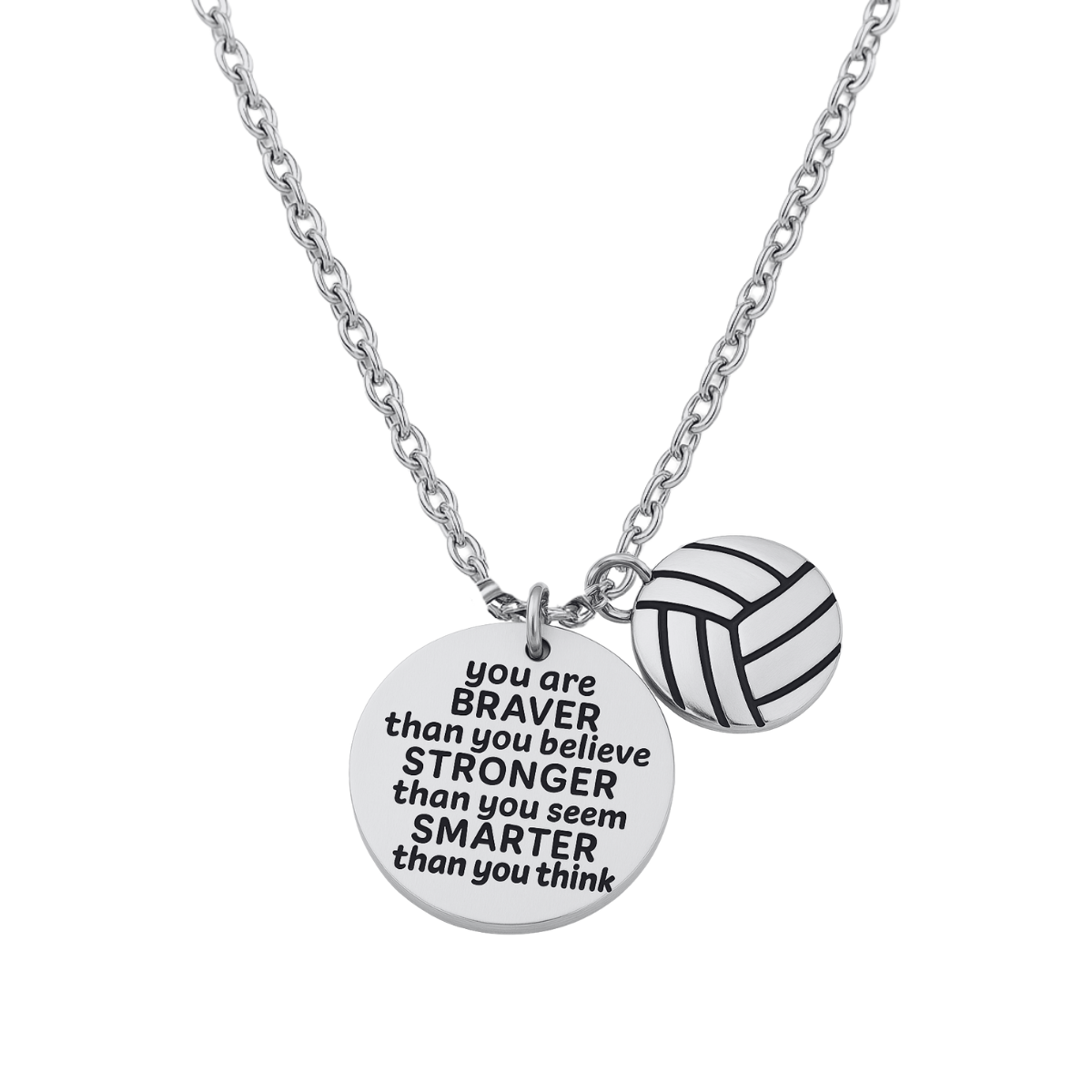 Silver Plated You Are Braver than you Believe, Stronger than you Seem, Smarter than you Think Charm and Volleyball charm on 17 inch stainless steel chain with 2 inch extender