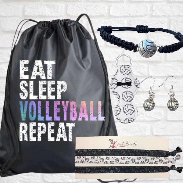 - Volleyball Eat Sleep Volleyball Repeat Nylon Drawstring Bag- This 14" W x 18"H bag is perfect for school, travel, or to carry clothing and equipment to and from practice.