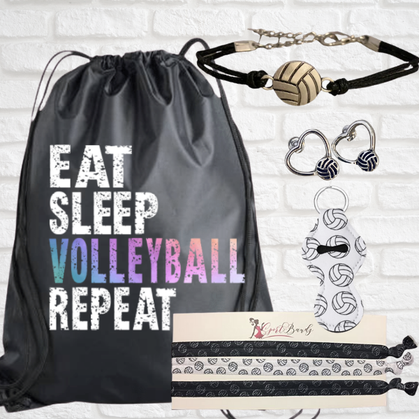- Volleyball Eat Sleep Volleyball Repeat Nylon Drawstring Bag- This 14" W x 18"H bag is perfect for school, travel, or to carry clothing and equipment to and from practice.